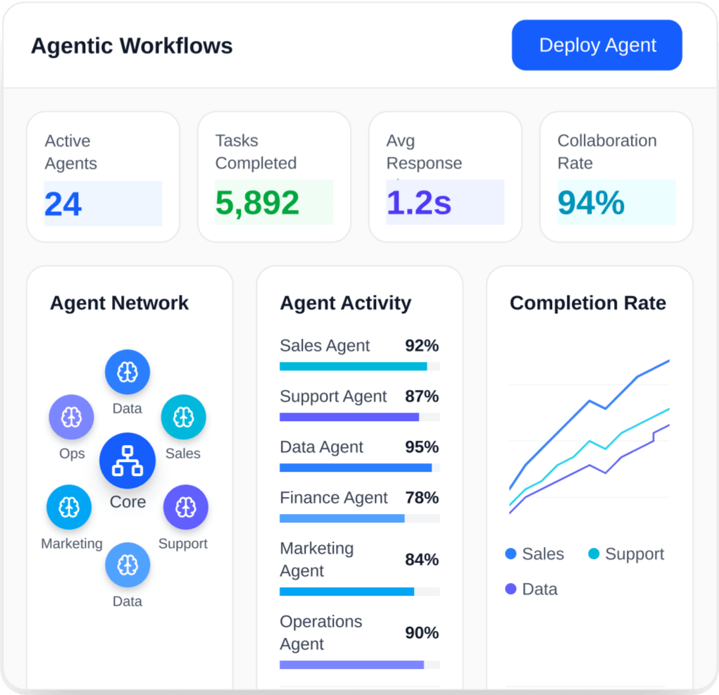 Deploy AI agents that think, decide, and act independently. Create sophisticated multi-agent systems that collaborate across departments, optimize processes in real-time, and adapt to changing business conditions without manual intervention.