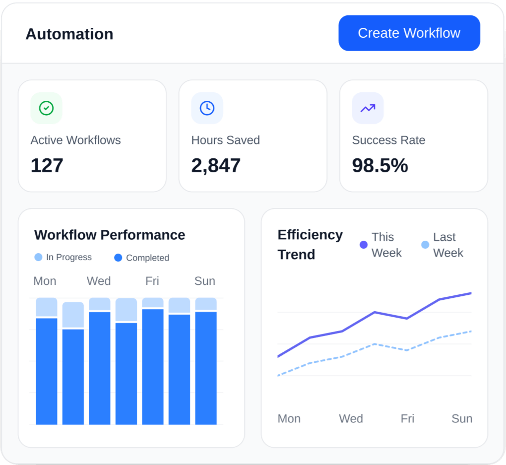 Eliminate manual tasks with intelligent automation workflows. From email responses to data entry, invoice processing to customer onboarding—let AI handle the routine so your team can focus on innovation and growth.