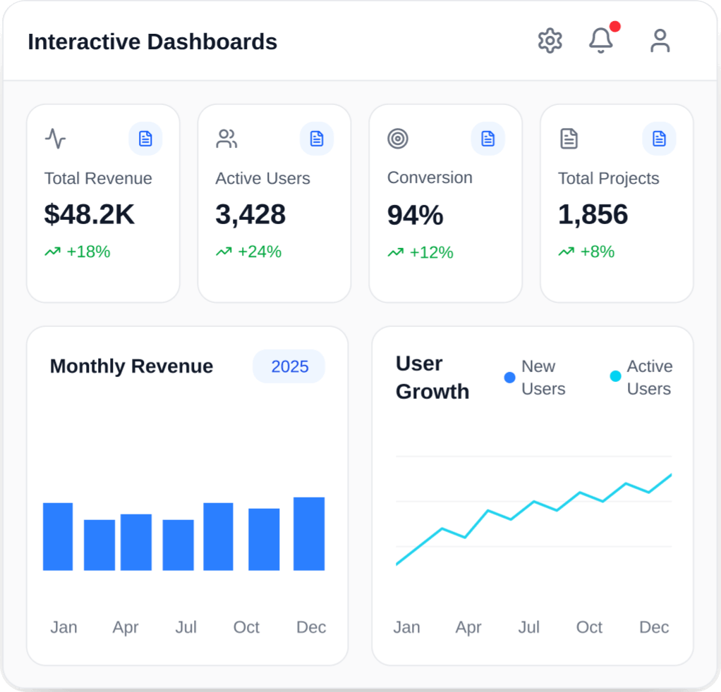Visualize your entire business with customizable dashboards and interactive charts. Track KPIs, monitor trends, and uncover insights with AI-powered analytics that turn your data into actionable intelligence.